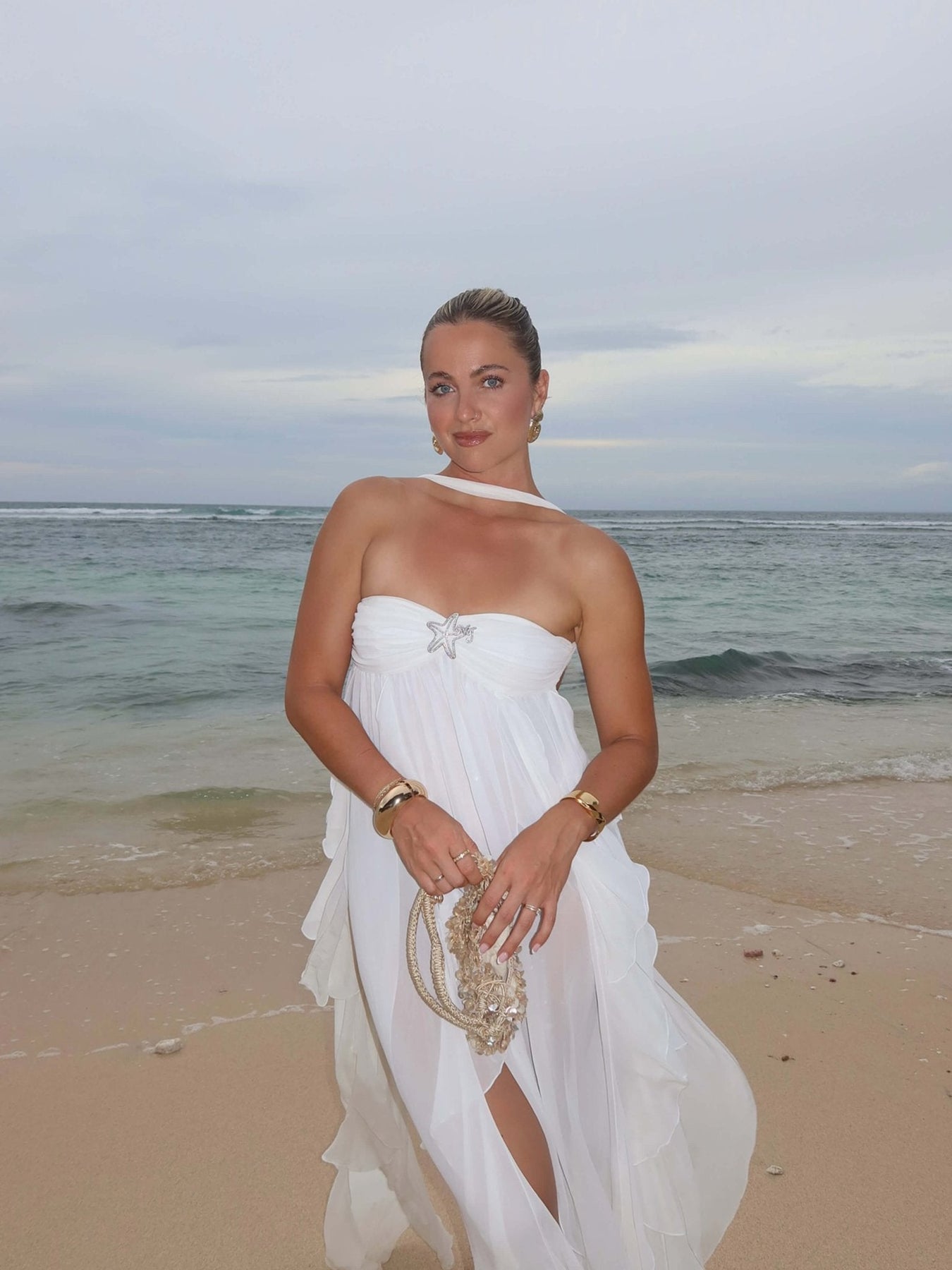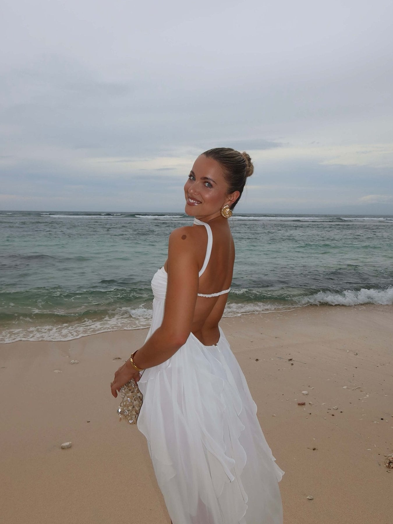 Karen Ruffle Maxi-klänningen är din favorit för feminin elegans. Tillverkad av ett lätt, böljande tyg, har den kaskadformade volanger, en smickrande åtsittande midja och en svepande silhuett som rör sig vackert med varje steg. Perfekt för trädgårdsfester, bröllop eller weekendresor, den här klänningen kombinerar tidlös charm med modern romantik för en look som drar blickarna till sig vart du än går.